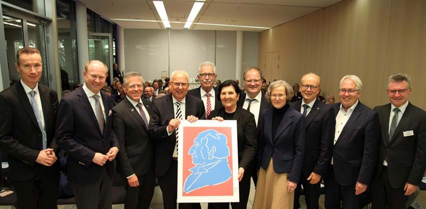 Verabschiedung der ehemaligen Landräte am 18. November 2025 im Rahmen der Landkreisversammlung (v.l.): HGF Dr. Martin Klein, Präsident Landrat Dr. Olaf Gericke, LR a.D. Hans-Jürgen Petrauschke, LR a.D. Dr. Karl Schneider, LR a.D. Thomas Hendele, LRin a.D. Eva Irrgang, LR a.D. Olaf Schade, NRW-Kommunalministerin Ina Scharrenbach und DLT-Präsident LR Dr. Achim Brötel. Quelle: LKT NRW