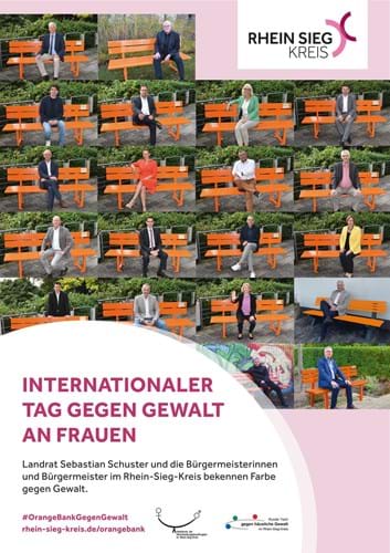 Facettenreich wie die interne gestaltet sich auch die externe Gleichstellungsarbeit im Rhein-Sieg-Kreis. Inspiriert aus Italien konnte seit 2021 die Aktion „Orange Bank gegen Gewalt im Rhein-Sieg-Kreis“ als Gemeinschaftsprojekt zur Prävention geschlechtsspezifischer Gewalt etabliert werden. Inzwischen hat die Aktion NRW-weit Schule gemacht. Das Besondere: junge Menschen werden zum Thema geschlechtsspezifischer Gewalt in Workshops sensibilisiert, während sie die Bänke bauen bzw. gestalten. Inzwischen stehen nahezu 60 orange gestaltete Bänke in allen 19 Kommunen im Kreisgebiet. Die Dokumentationen zur Aktion sind hier abrufbar: https://www.runder-tisch-gegen-haeusliche-gewalt-rsk.de/internationaler-tag-gegen-gewalt-an-frauen/kreisweite-aktion-orange-bank/