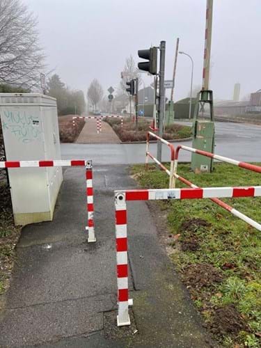 Ein typisches Beispiel für eine Umlaufsperre, die den Radverkehr behindert oder sogar gefährdet. Ein Durchkommen mit einem Lastenrad oder Kinderanhänger ist kaum möglich. Mittlerweile ist die Umlaufsperre aufgrund der Empfehlung des Radroutenkonzepts entfernt worden.