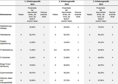 Zum 31.12.2023 haben die Gesundheitsämter in den drei Handlungsfeldern Mitarbeitende, IT-Sicherheit sowie Software, Daten und Interoperabilität im Median Stufe 0, in den drei Handlungsfeldern Digitalisierungsstrategie, Bürger- und Bürgerinnenzentrierung und Zusammenarbeit bereits Stufe 1 und im Handlungsfeld IT-Bereitstellung Stufe 2 realisiert. Zusätzlich wird in der Tabelle der Prozentsatz aufgeführt, der den Anteil der Gesundheitsämter repräsentiert, die mindestens Stufe 0 erreicht haben. Dieser ist in allen Handlungsfeldern mit jeder Erhebungswelle angestiegen. In vier Handlungsfeldern haben im Jahr 2023 bereits einzelne Gesundheitsämter die höchste Stufe 4 erreicht.